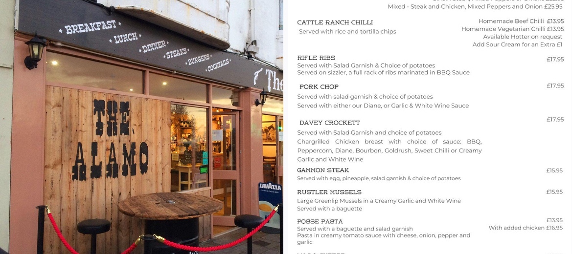Experience the authentic cowboy vibe at The Alamo Bar & Grill in Ryde! Savor our mouthwatering T-bone steak, delicious fajitas, and peppercorn sauce, all complemented by a great selection of real ales. We also offer a family-friendly kids menu for the little ones. Visit us at 5 Esplanade, PO33 2DY, or call +44 1983 638234 to reserve your table today!