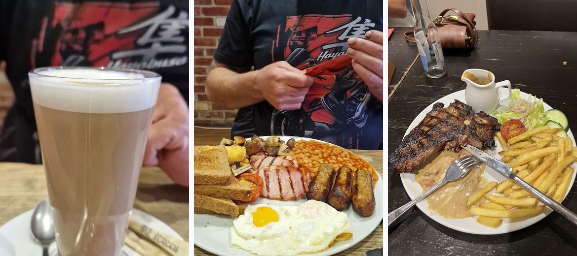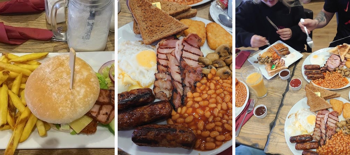 Expect a diverse menu featuring everything from breakfast items like a large English breakfast to hearty mains such as t-bone steak and specialty burgers.